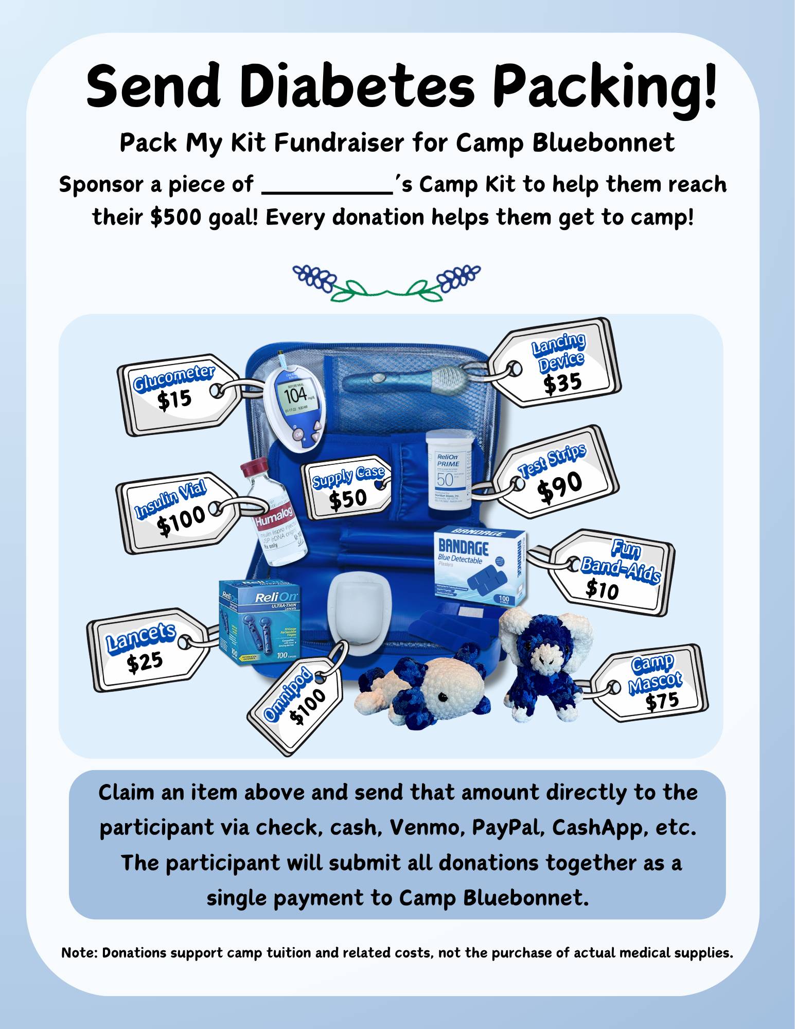 For our Send Diabetes Packing fundraiser (March 26-June 10), each participant’s goal is to raise $500 by having your community “buy” items for your diabetes bag.