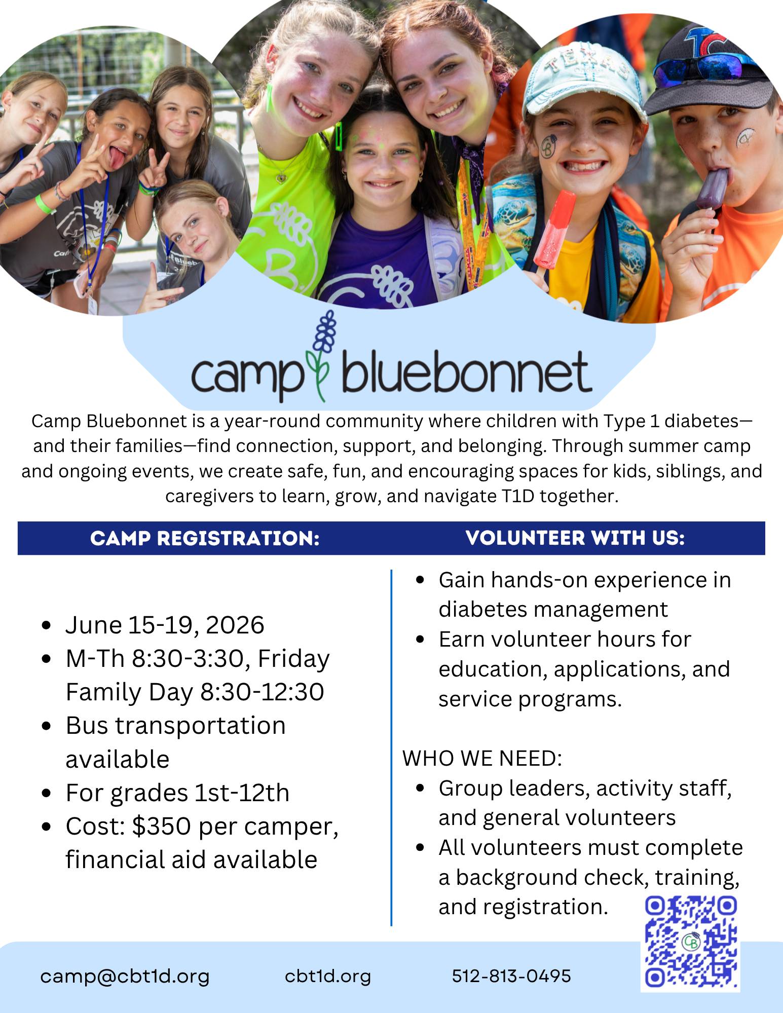Stay connected with Camp Bluebonnet through The Bluebonnet Bulletin—your source for upcoming events, camp news, and ways to get involved in our type 1 diabetes community.
